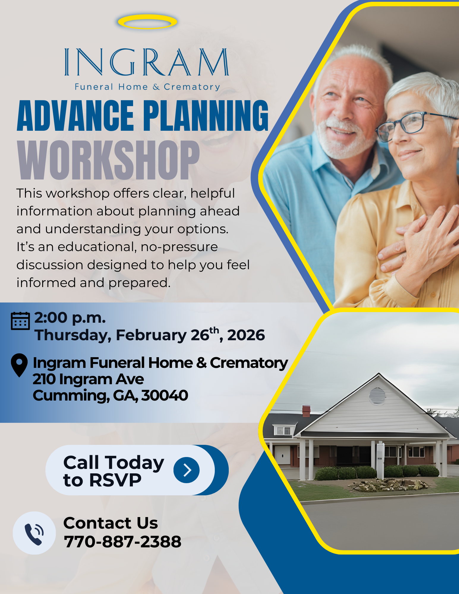 At Ingram, we understand the importance of honoring each unique life. That's why we offer a comprehensive range of options for funeral, cremation, burial, and pre-planning services. Whether you're in Cumming, GA, or the surrounding areas, we're here to support you through every step of the journey.